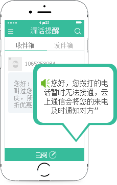 当用户因无法正常接听电话而有漏接电话时,如关机、不在服务区的时候,能够发现并告知用户漏接的电话信息。 可与个性应答和语音信箱组合使用 标记号码归属地+骚扰电话 免费体验 立即接入